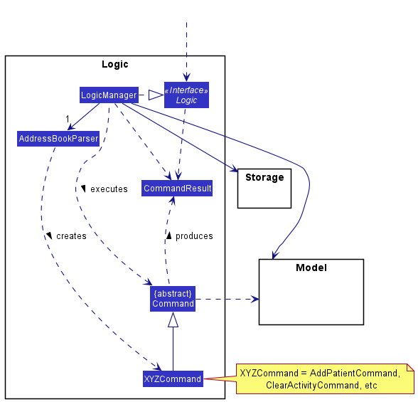 Commandobject (more precisely, an object of one of its subclasses e.g.,AddPatientCommandwhich is executed by theLogicManager. - The command can communicate with the